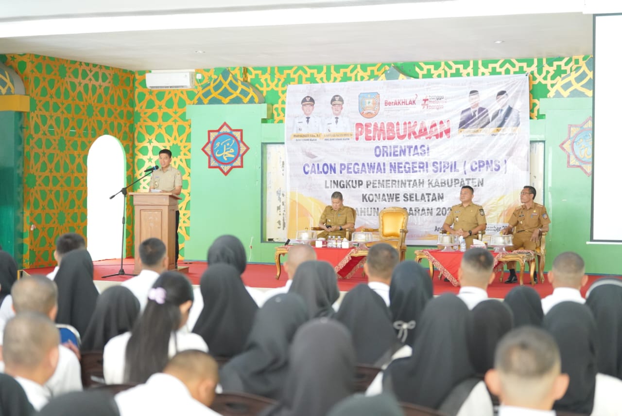 Beritarakyat.co, Konawe Selatan – Bupati Konawe Selatan, Irham Kalenggo, S.Sos., M.Si., secara resmi membuka Orientasi Calon Pegawai Negeri Sipil (CPNS) Tahun 2025 di Gedung Islamic Center Andoolo, Selasa (16/9/2025). Kegiatan ini diikuti oleh 163 peserta dan akan berlangsung selama dua hari, sebelum dilanjutkan dengan Pelatihan Dasar (Latsar) selama tiga bulan ke depan.