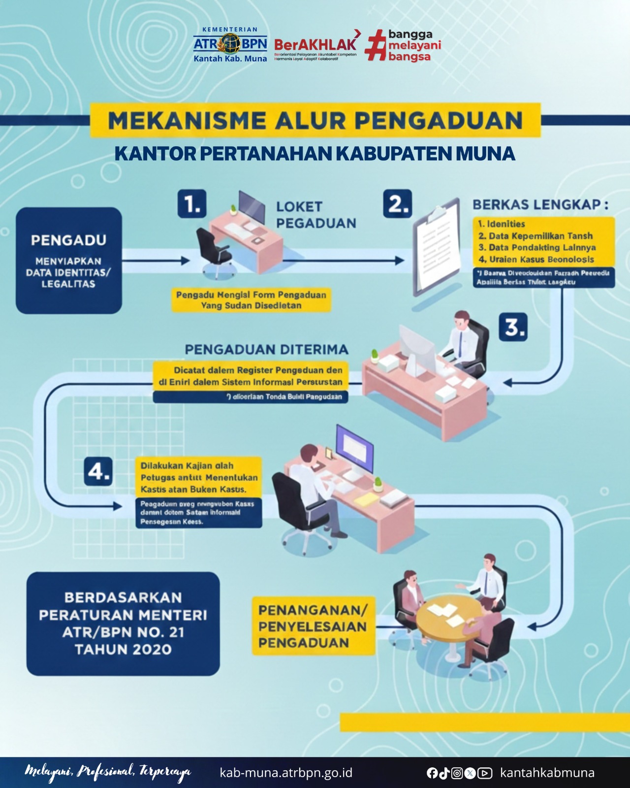 BeritaRakyat.co, Muna – Dalam rangka memberikan pelayanan yang transparan, profesional dan akuntabel, Kantor Pertanahan Kabupaten Muna menerapkan mekanisme alur pengaduan.