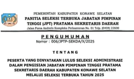 BeritaRakyat.Co, Konawe Selatan – sebanyak empat bakal calon Sekretaris Daerah (Sekda) Konaw Selatan yang berhasil mengikuti seleksi administrasi. Ke empat calon sekda tersebut selanjutnya akan berkompetisi dan ditetapkan sebagai Sekda dan dilantik oleh Bupati Konawe Selatan.