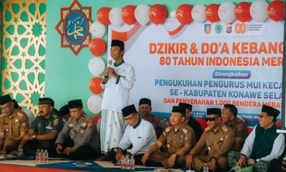 Ketua MUI Konsel, Wildan Habibi, menegaskan bahwa membela negara adalah bagian dari iman. “Dzikir dan doa ini adalah ikhtiar kita memohon perlindungan Allah SWT untuk bangsa Indonesia. Sementara pembagian seribu bendera Merah Putih adalah simbol nyata untuk menumbuhkan semangat nasionalisme, yang sejalan dengan ajaran agama,” jelasnya.
