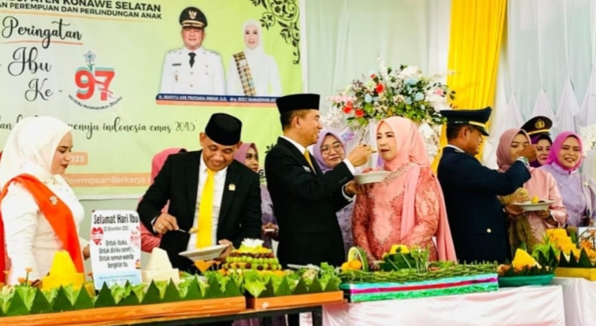 Rangkaian kegiatan Peringatan Hari Ibu ke-97 diakhiri dengan prosesi pemotongan tumpeng oleh Bupati Konawe Selatan, Ketua DPRD, Sekretaris Daerah, serta jajaran Forkopimda sebagai simbol kebersamaan dan penghormatan terhadap peran ibu dalam keluarga, masyarakat, dan pembangunan daerah.