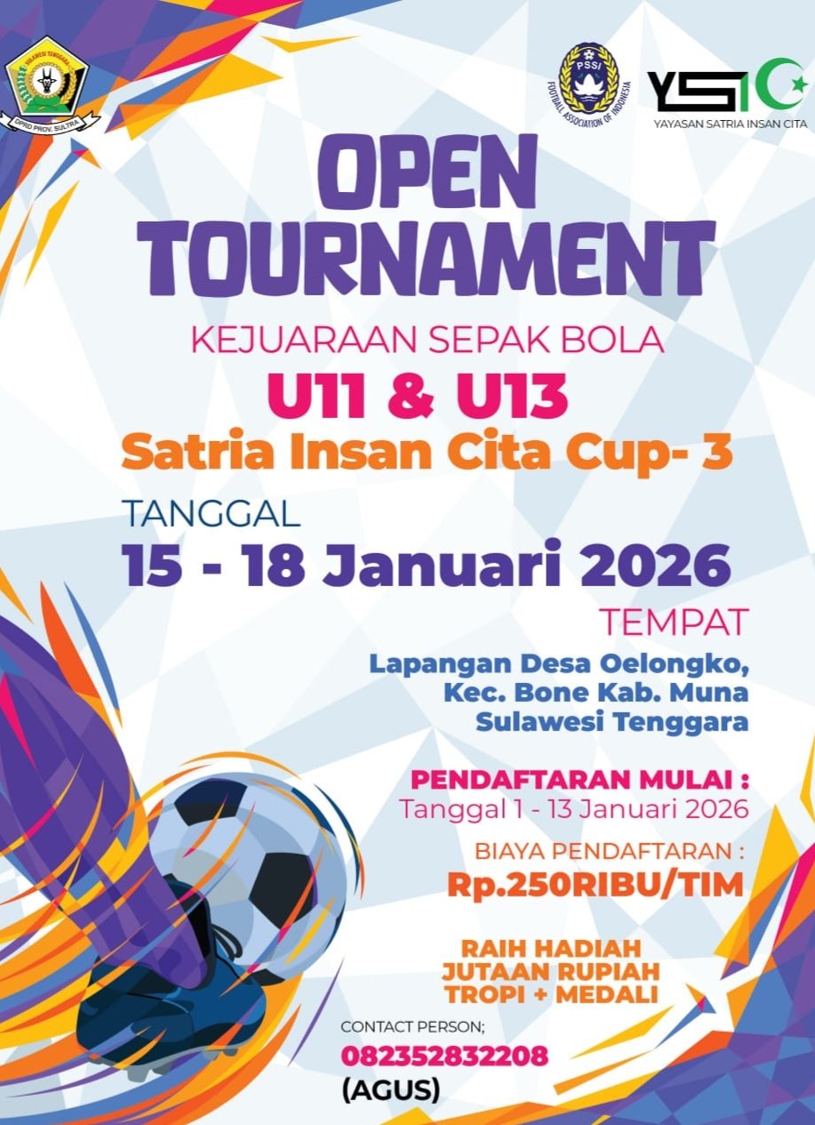 Tournamen Satria Insan Cita Cup lll itu bakal di ikuti anak usia 11 tahun dan 13 tahun. Menjelang kegiatan pembukaan pada Sabtu (17/01/2026) mendatang, tercatat 28 Club sepak bola asal Kabupaten Muna dan Muna Barat telah mengonfirmasi keikutsertaannya.