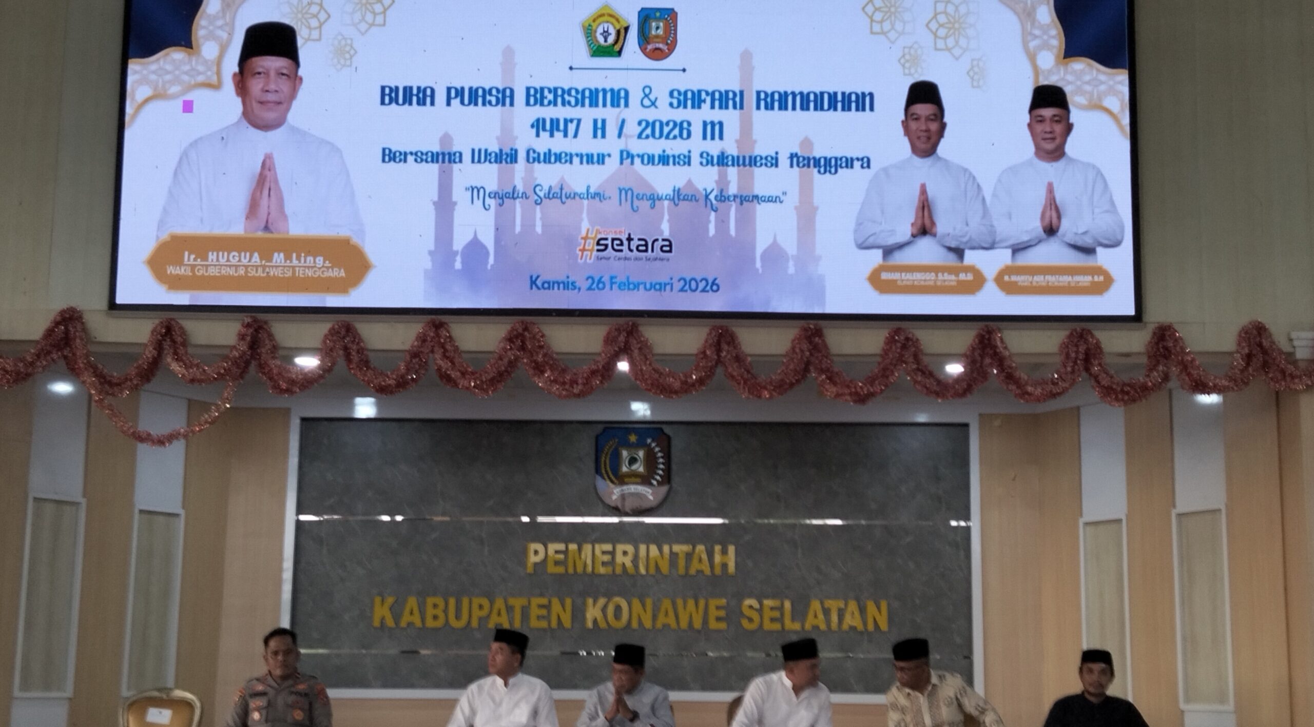 BeritaRakyat.Co, Konawe Selatan – Wakil Gubernur Sultra Ir Hugua M Ling membersamai Bupati Konsel Irham Kalenggo bersama Wakil Bupati H Wahyu Ade Pratama Imran dan jajaran serta warga setempat melaksanakan buka puasa bersama di rumah Jabatan Bupati Konawe Selatan di Kelurahan Potoro Kecamatan. Andoolo Rabu, (26/02/2026).